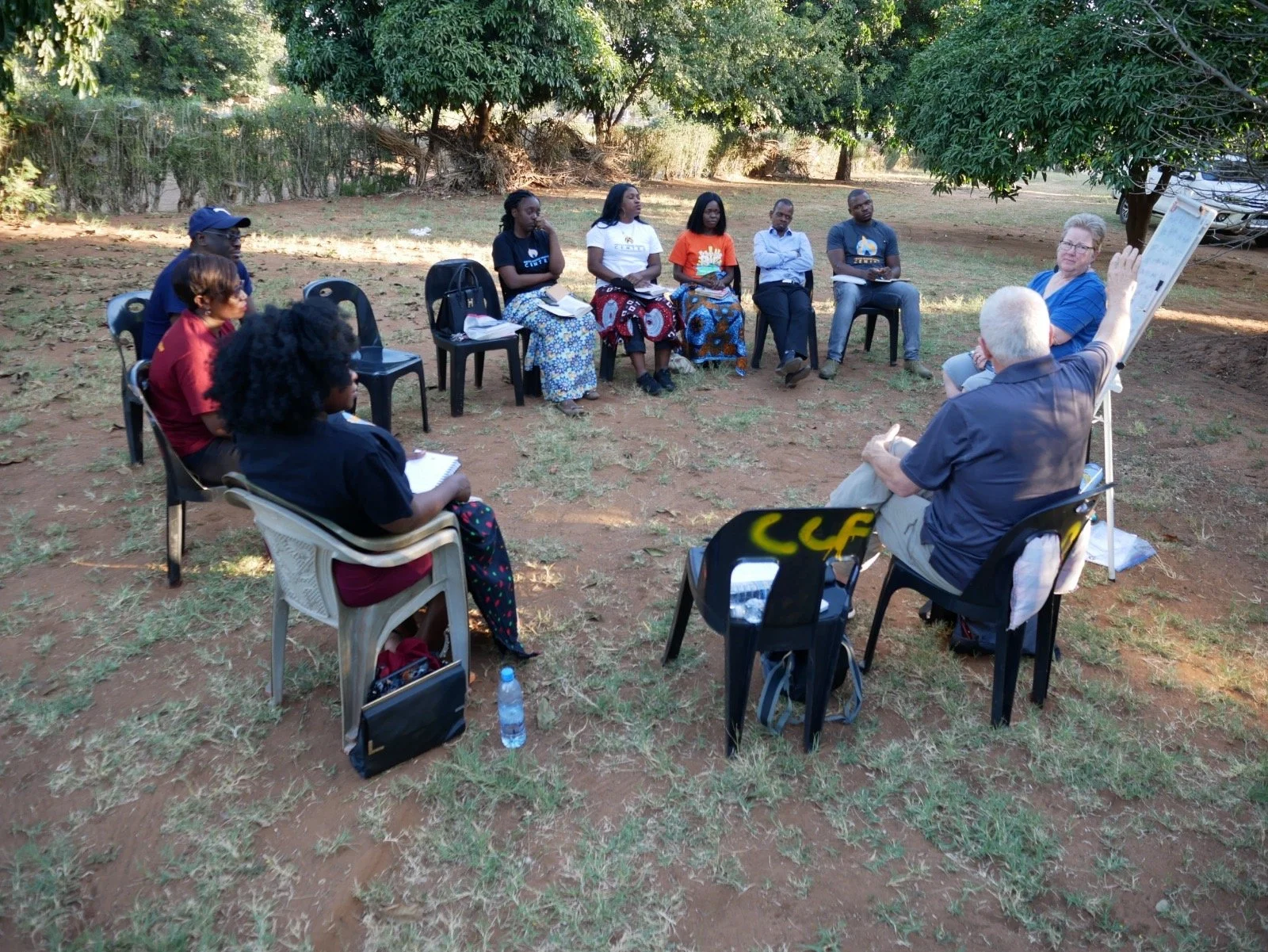 Teaching under a tree is cooler as the heat of the day intensifies.